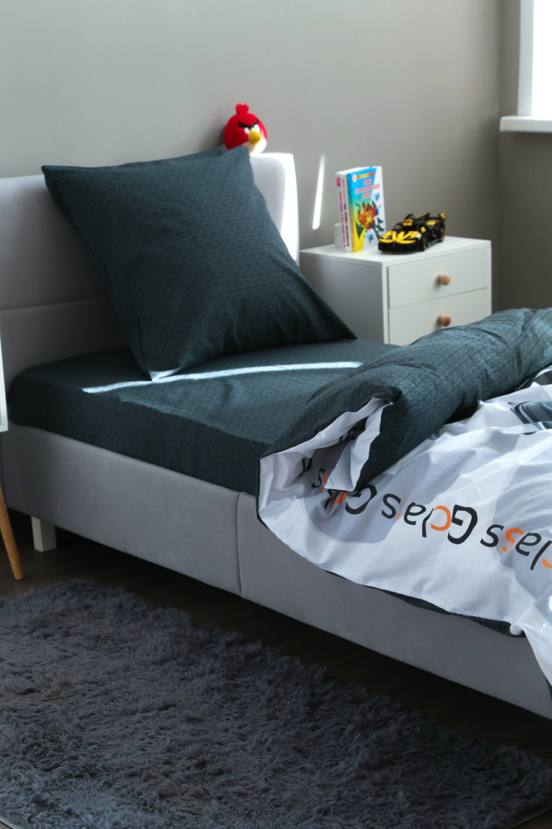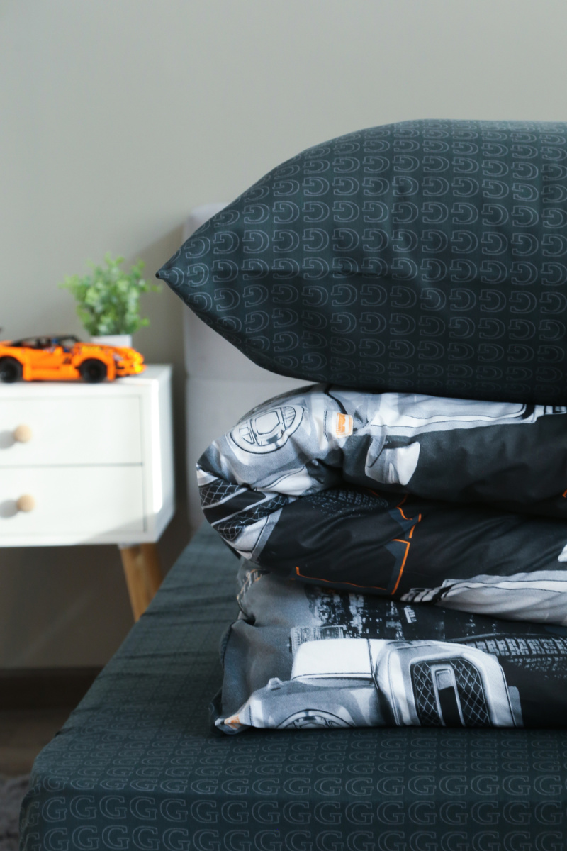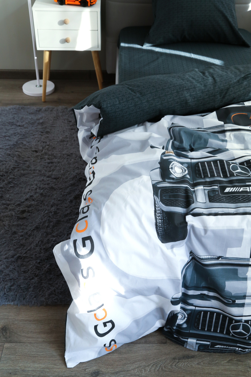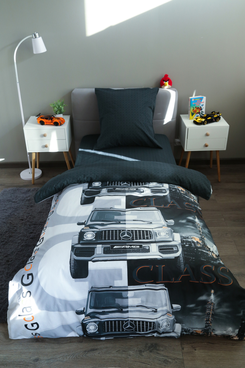 Детское постельное белье 1,5 спальное черное с рисунком автомобиля гелентваген мерседес в сером фоне из ткани поплин на 1.5 спальную кровать. Стильный дизайн гелентваген машинка понравится мальчишкам и подарит яркие мечты и сны. Постельное белье из натуральной ткани плотности 115 гр/м2, состоящий из 100% хлопка, абсолютно экологичен, не вызывает аллергии, хорошо пропускает воздух, позволяя телу дышать. При правильном уходе постельное белье 1.5 спальное с машиной прослужит вам долгое время. Предварительная стирка обязательна. Перед стиркой вывернуть изделие на изнаночную сторону. Стирать отдельно от синтетических изделий. Машинная стирка при максимальной температуре 40С, мягкий режим. Постельное белье детское 1,5 спальное с машинками стирать моющими средствами для цветных тканей. Не отбеливать. Гладить с изнаночной стороны при максимальной температуре утюга. Усадка после стирки до 3%, от заявленных размеров изделия. Ткань не подвержена образованию катышков.