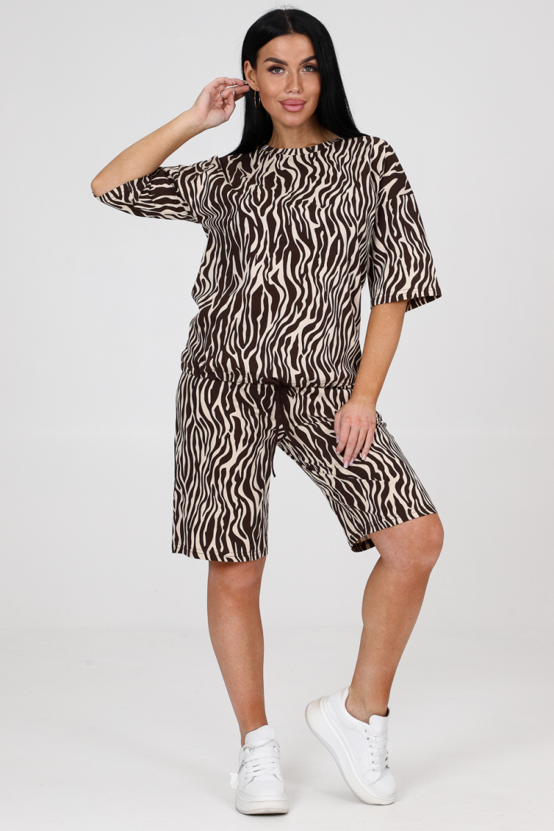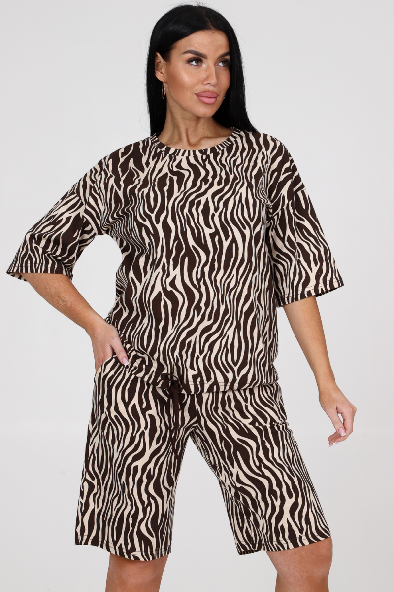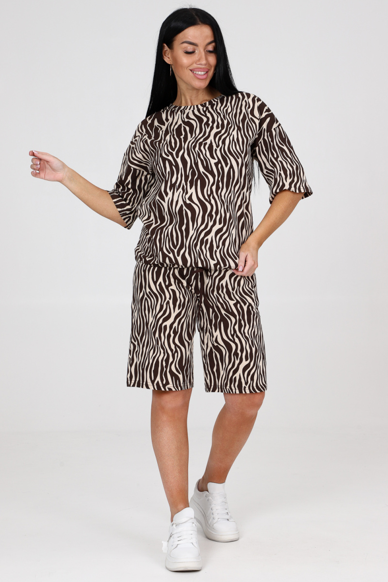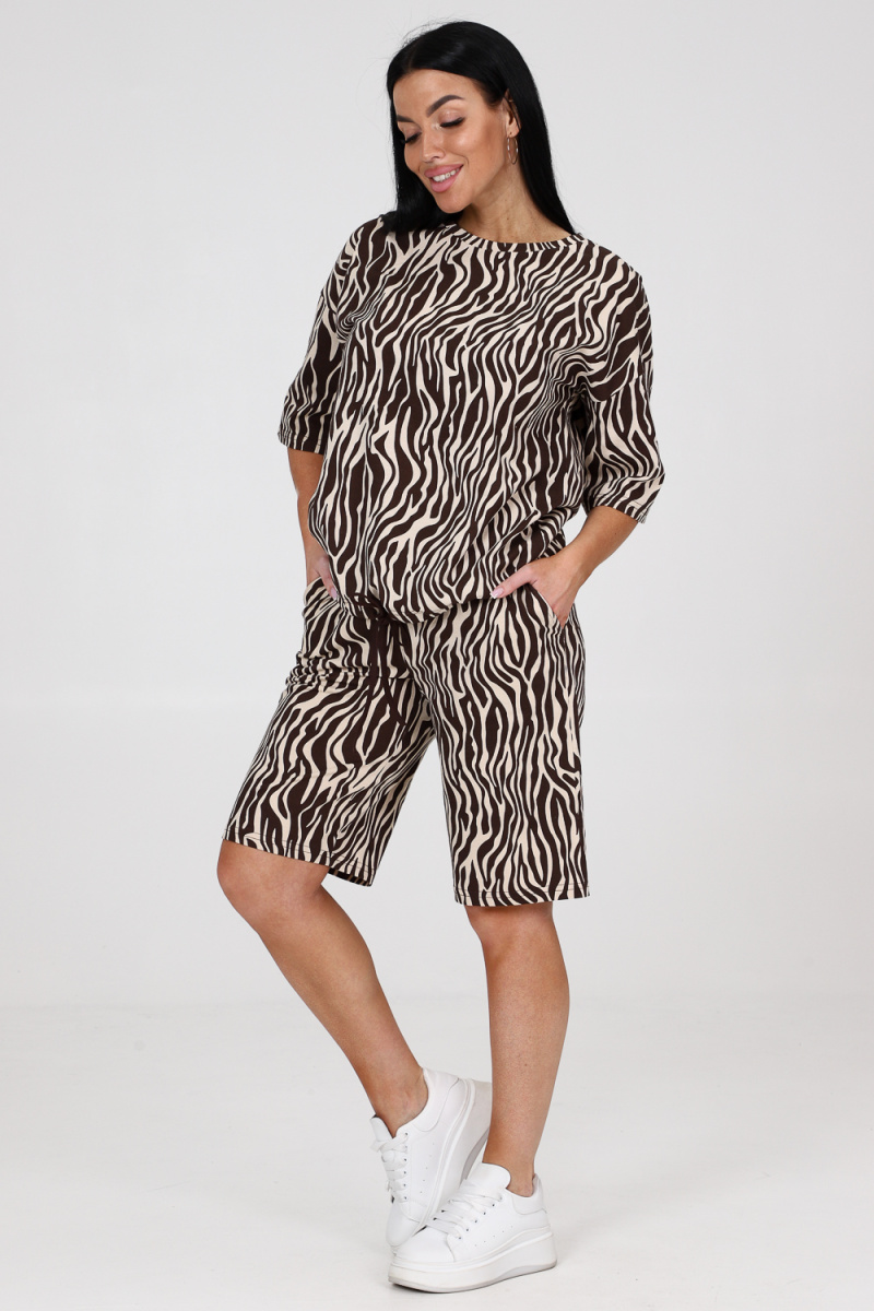 Костюм женский из кулирки. Костюм состоит из блузы и шорт. Блуза свободного покроя, рукав втачной, по низу изделия кулиса. Шорты на притачном поясе с карманами.