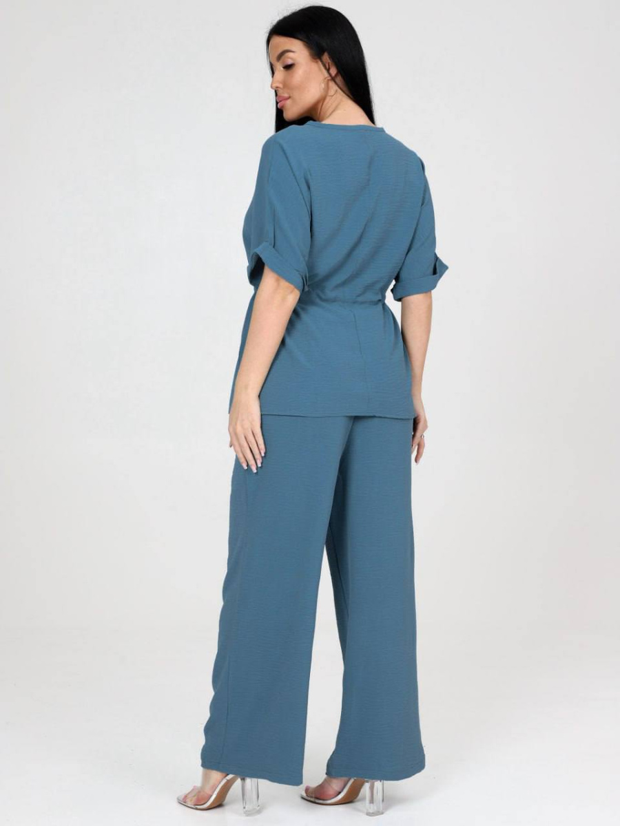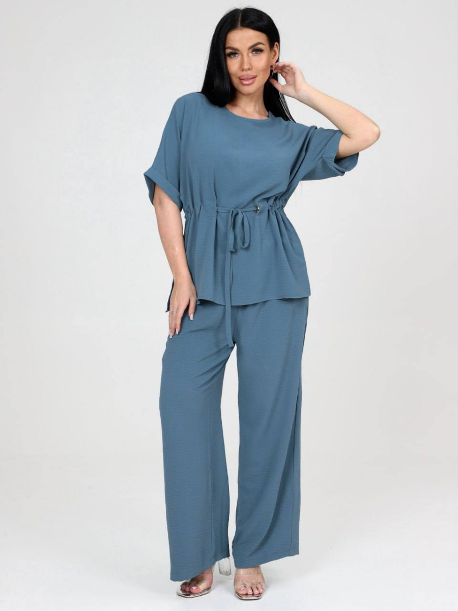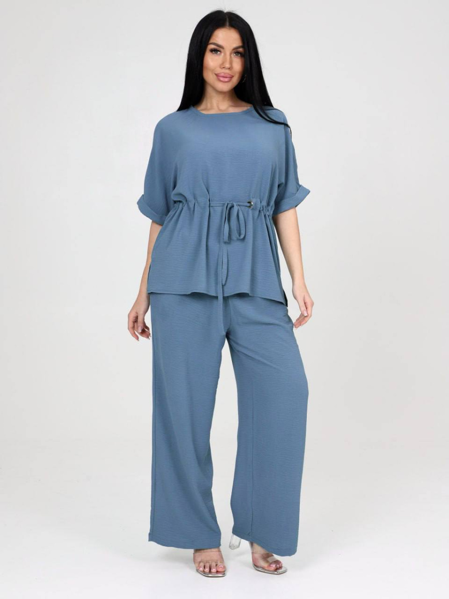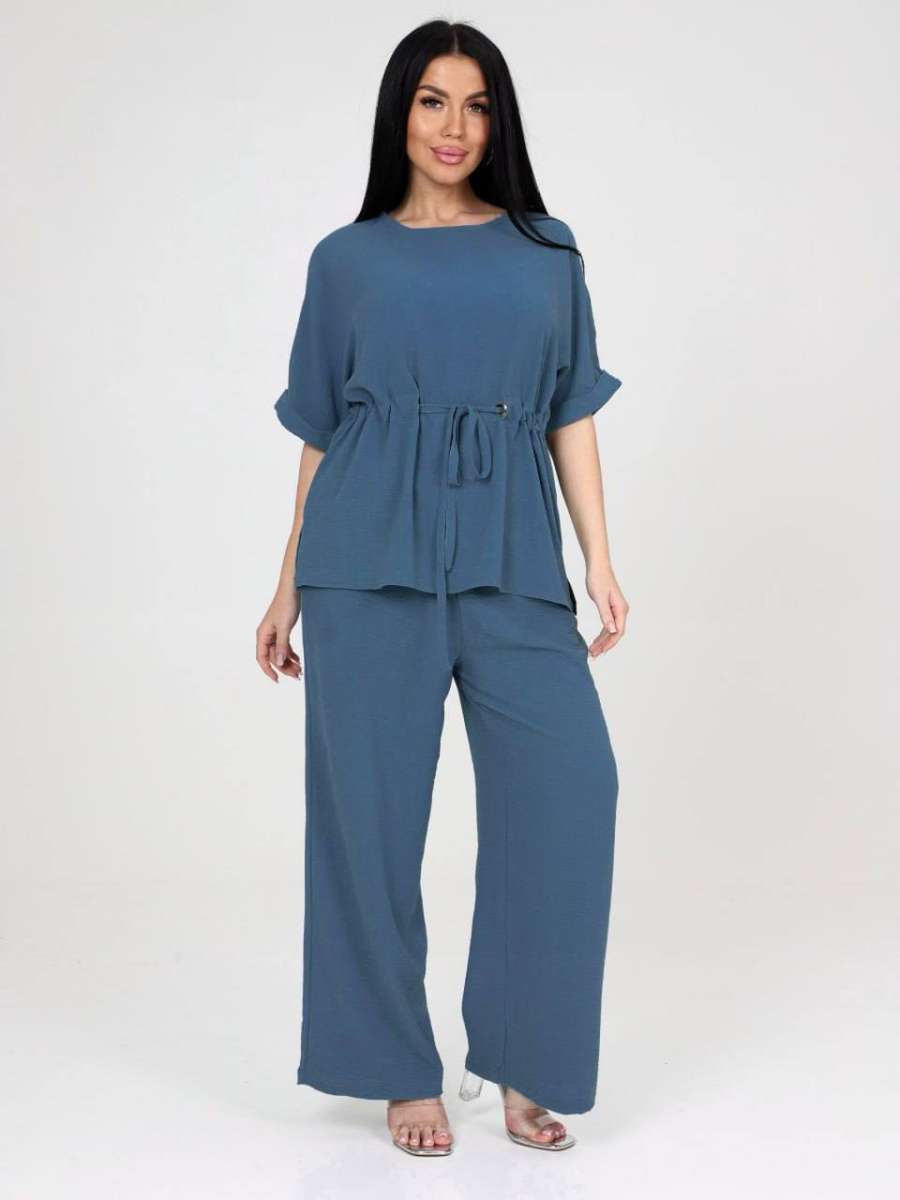 Представляем Вам костюм двойку. Костюм состоит из туники и брюк свободного кроя и доступен в трех расцветках. Модель туники напоминает летучую мышь, что придает костюму легкость и воздушность. Этот костюм - идеальное решение для жаркой погоды, благодаря его легкому и воздушному материалу.