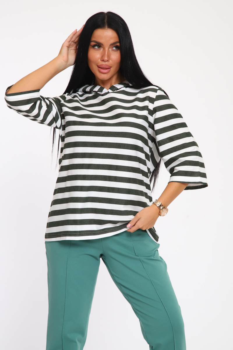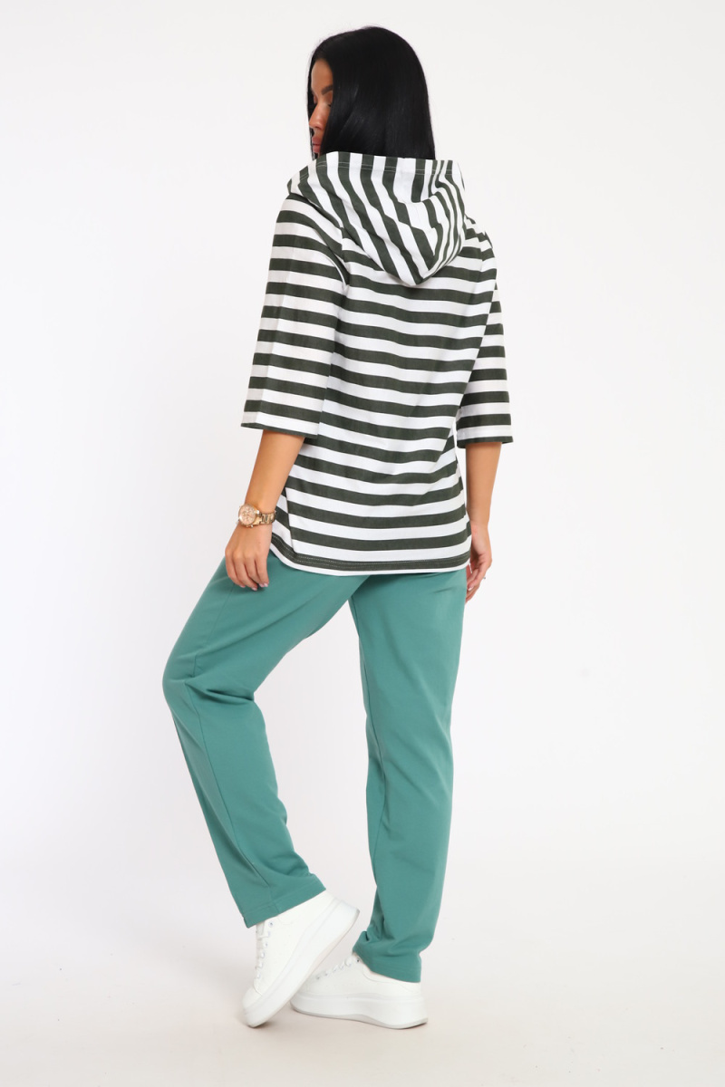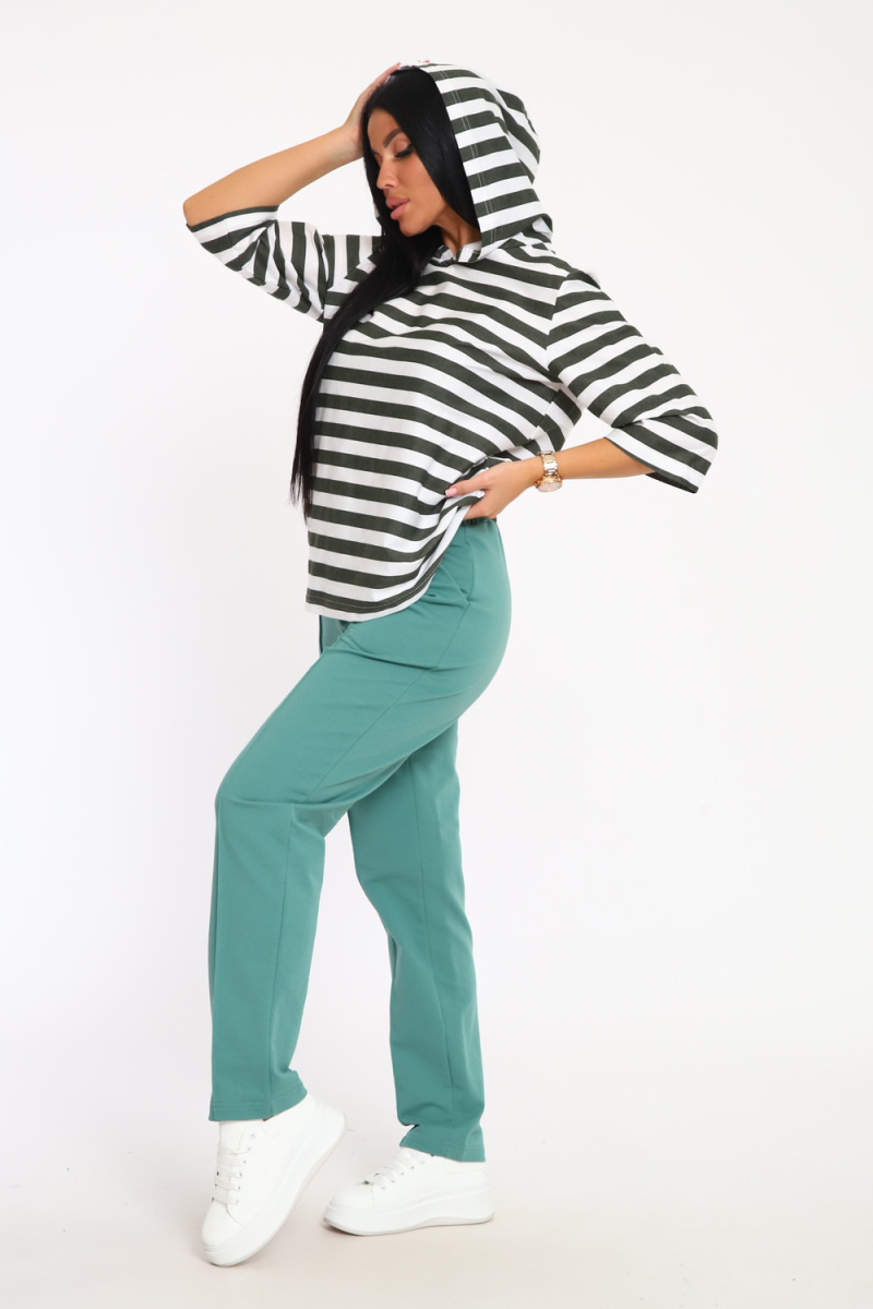 Представляем Вашему вниманию современный костюм, состоящий из брюк и футболки с капюшоном. Футболка в полоску –это модный тренд уже несколько сезонов подряд Футболки с капюшоном-универсальная вещь, которая обязательно должна присутствовать в гардеробе любой девушки и женщины. В сочетании с такой футболкой можно наработать огромное количество образов, как на каждый день ,так и для различных мероприятий. Обожающие эксперименты девушки и женщины могут сочетать футболку с классическими брюками, чтобы соответствовать экстравагантному стилю спортшик. Наша модель брюк с отстроченной стрелкой спереди, двумя боковыми карманами, поясом на резинке отлично подходит для этого. Добавить к стильному луку можно туфли на высоком каблуке или стильные ботинки на толстой подошве .Женщина будет выглядеть независимо и очень модно. Наряд можно дополнить яркими аксессуарами и образ уже подойдет для выхода в люди. Футболка выполнена из 100%хлопка.В ней будет комфортно в любую погоду .Брюки выполнены из трикотажного полотна .которое