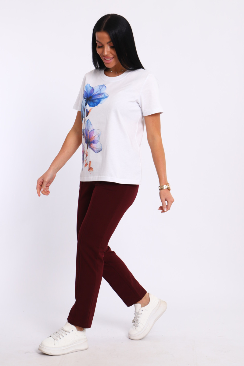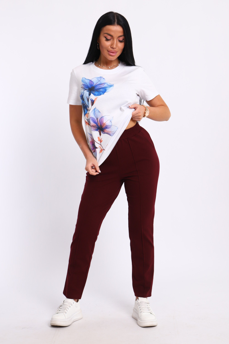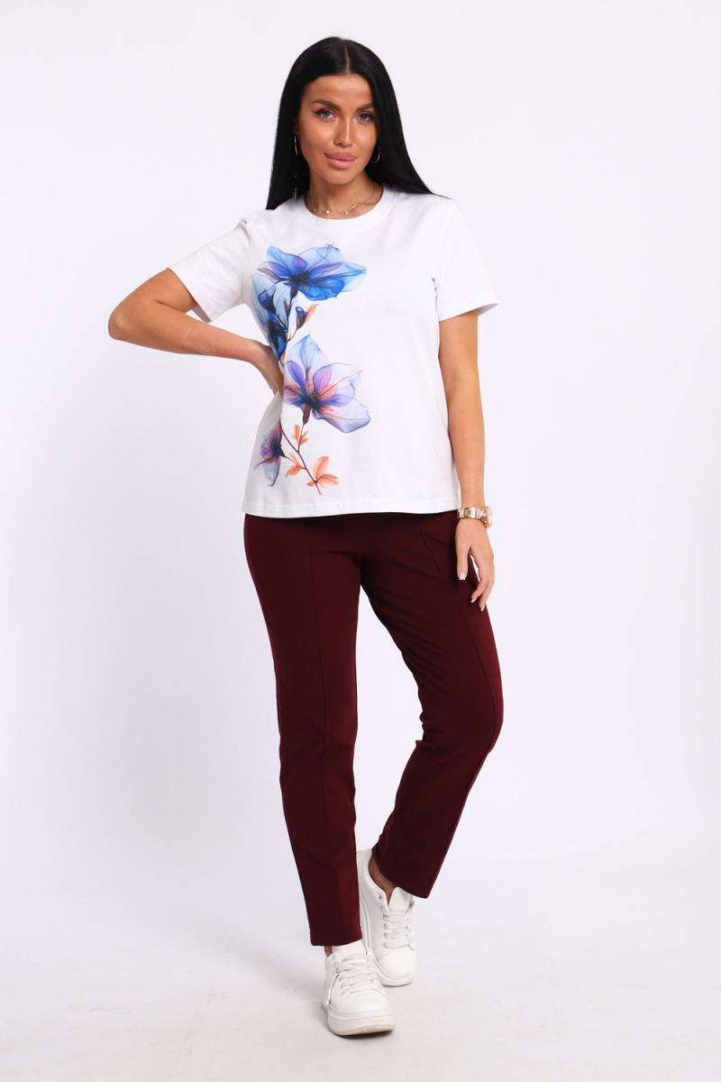 Представляем вашему вниманию современный костюм, состоящий из брюк и футболки. Брюки классические с отстроченной стрелкой спереди, двумя карманами, пояс на резинке. Футболка свободного кроя, с принтом. Костюм обладает отменными практическими характеристиками, и на долгое время сохранит свой первоначальный вид.