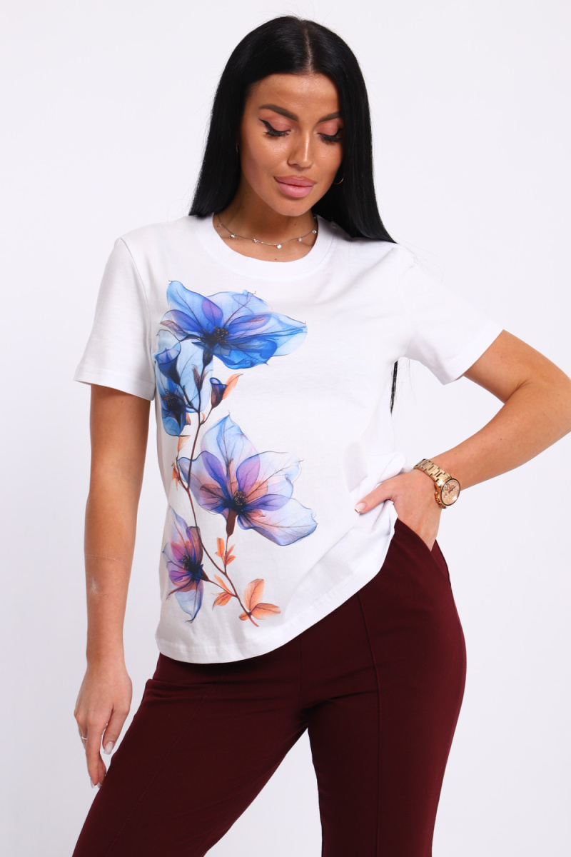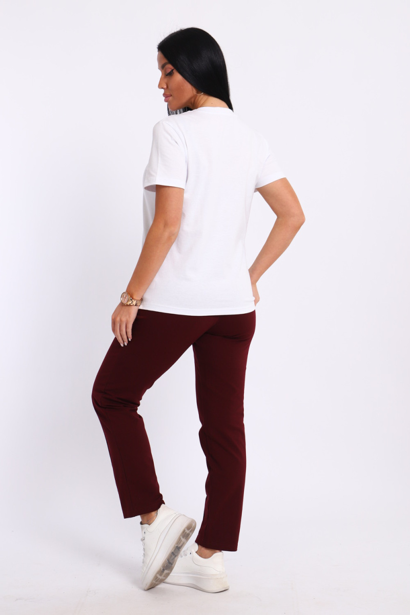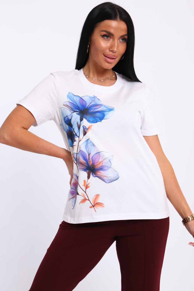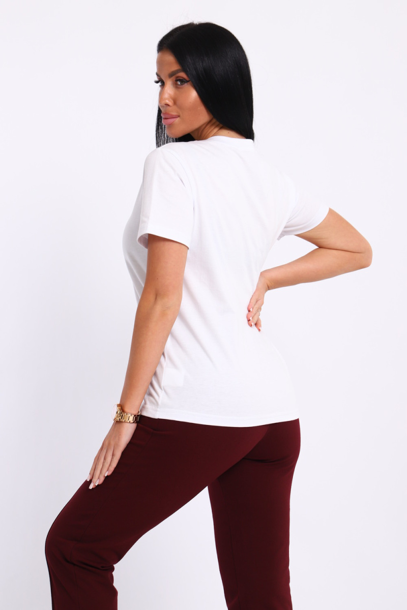 Представляем вашему вниманию современный костюм, состоящий из брюк и футболки. Брюки классические с отстроченной стрелкой спереди, двумя карманами, пояс на резинке. Футболка свободного кроя, с принтом. Костюм обладает отменными практическими характеристиками, и на долгое время сохранит свой первоначальный вид.